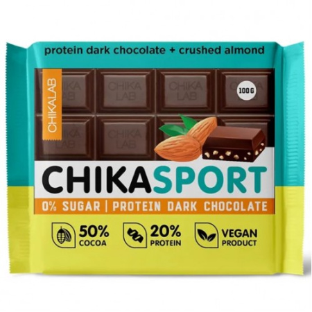 Темный шоколад с миндалем CHIKALAB - это протеиновый шоколад без добавления сахара. Внутри ароматный миндаль с темным натуральным шоколадом (50%). Шоколад подходит для веганского рациона без добавления продуктов животного происхождения, подойдет для перекуса между приемами пищи, для добора белка в вашем рационе, для замены сладких вредных десертов.&